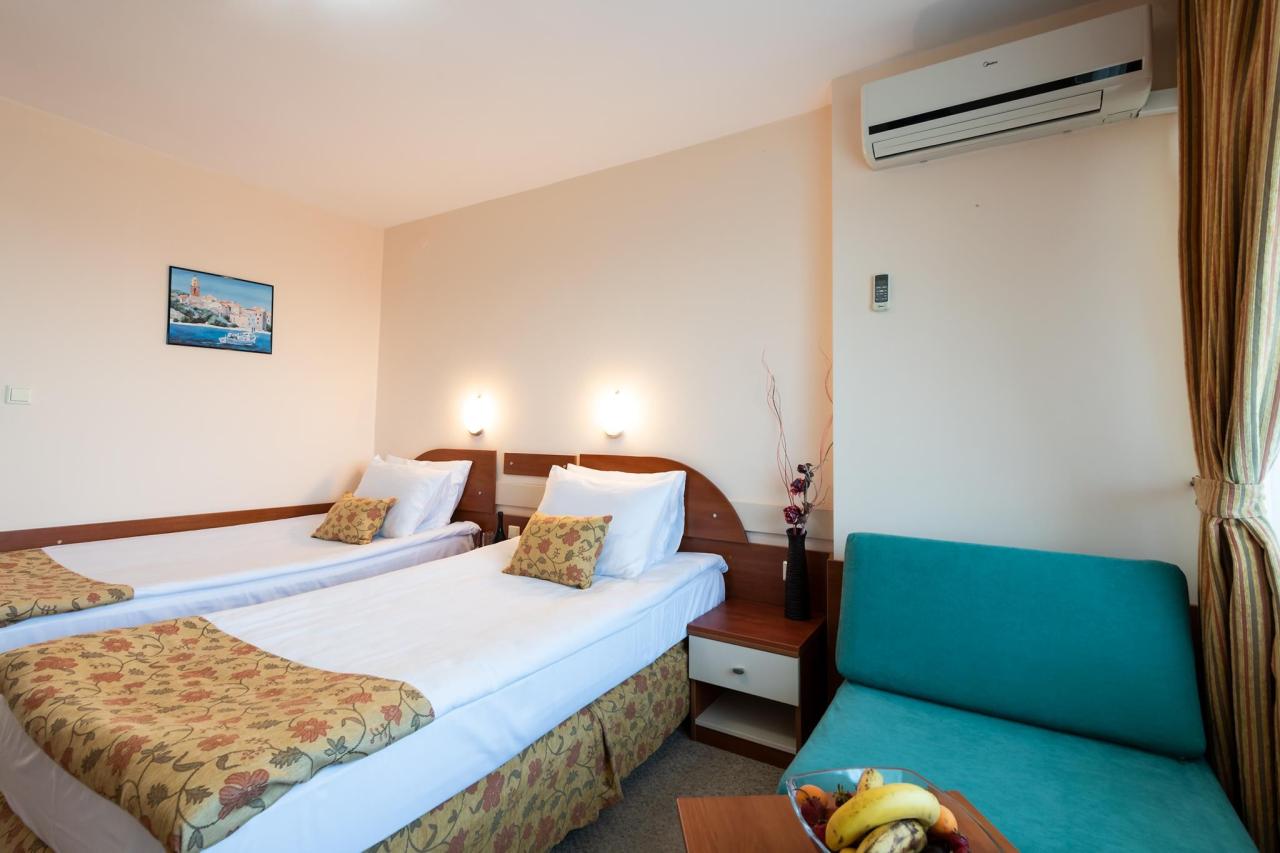 Priamo pri širokej piesočnatej pláži s pozvoľným vstupom do mora v južnej časti letoviska Slnečné pobrežie, cca 800 m od živého centra. Reštaurácie, bary a obchody v okolí, historický Nessebar cca 3 km a medzinárodné letisko Burgas vzdialené cca 28 km. |