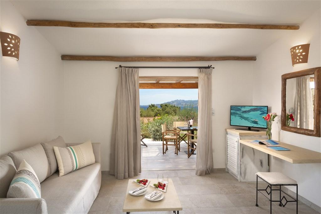 Všechny pokoje jsou v přízemí se samostatným vstupem a jsou vybaveny telefonem, TV-sat., individuální klimatizací, trezorem, vysoušečem vlasů, minibarem a verandou s posezením či 2 lehátky. Suite kromě terasy disponují také zadním patiem, 2 TV a klimatizací v obou pokojích. Pokoje v parku (del parco) se nachází ve vzdálenosti 400-600m od moře v klidné zóně v zeleni, pokoje v zálivu (del golfo) jsou v hlavní budově hotelu ve vzdálenosti 200-400m od moře. Standard: pokoj s manželskou postelí a možností 3. lůžka pro dítě do 16ti let. Suite: pokoj s manželským lůžkem, obývací pokoj s možností 2 lůžek pro dvě děti do 16 let. Senior Suite: jako suite, navíc s další ložnicí (oddělené postele na vyžádání). |