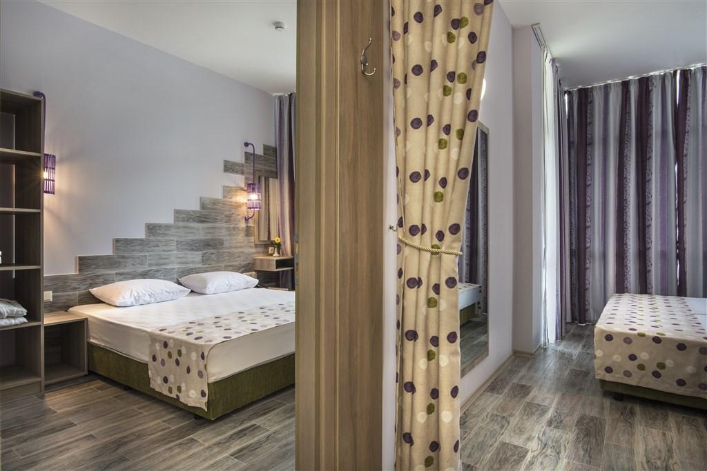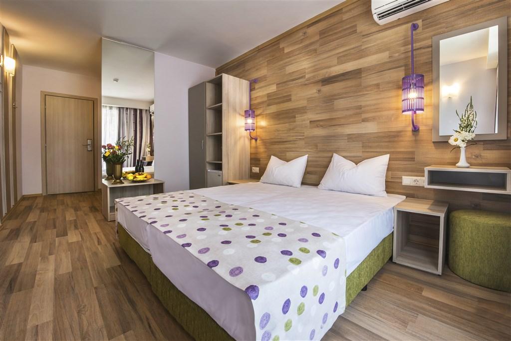 klimatizované 2-lôžkové izby, štúdiá a apartmány • IZBY - dvojlôžkové s možnosťou prístelky • ŠTÚDIO - pre 3 až 4 osoby (max. 3 dosp.os.+1 dieťa) • APARTMÁNY pre 4 až 6 osôb - 2 miestnosti (max. 4 dosp.os. + 2 deti) • sprcha/WC • sušič na vlasy • telefón • SAT-TV • minichladnička • balkón s výhľadom do parku • výhľad na morskú stranu za príplatok • možnosť WiFi pripojenia zdarma • trezor zdarma • detská postieľka na vyžiadanie zdarma (obmedzený počet) • animačné programy |