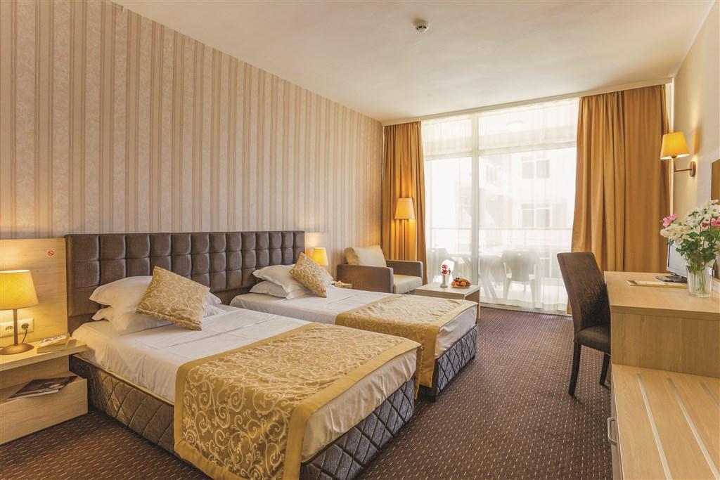 vstupná hala s recepciou • trezor na recepcii za poplatok • zmenáreň • výťah • reštaurácia • lobby bar • detské ihrisko • 2 vonkajšie bazény • bazén pre deti • vlastný aquapark, ktorý môžete využívať bezplatne • bar pri bazéne • WiFi pripojenie zdarma • slnečníky a ležadlá pri bazéne zdarma • za poplatok - SPA centrum (sauna a masáže) • kozmetika • fitness • biliard • minigolf • stolný tenis • parkovisko cca 25 Leva/ deň (nutná rezervácia vopred • platba na recepcii) |
